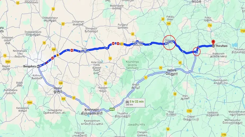 - Common route: Bangalore → Hosur → Krishnagiri → Vellore → Tiruttani